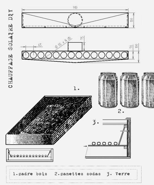 Recyclage de cannettes d'aluminium pour créer un panneau solaire. Un échange thermique important entre les canettes chaudes et l'air froid permet à cette dernière de gagner de précieux degrés qui sont directement ré-injectés dans la Cellule. En utilisant des canettes en aluminium, la surface de contact du cylindre est supérieure à celle d'un plan. L'aluminium a la particularité de très bien capter la chaleur et cherche immédiatement à la retransmettre.